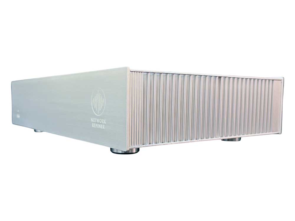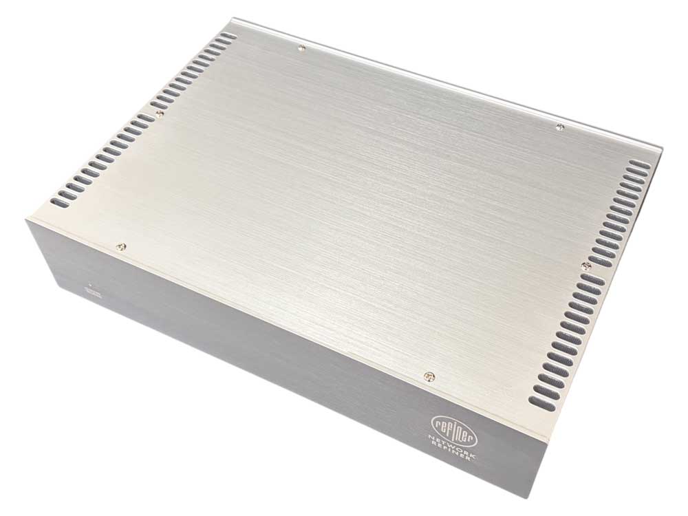 NETWORK REFINERはネットワークオーディオの音質向上を目的としたオーディオ用スイッチングハブです。SW0200 は音質劣化の要因である LAN ポートからのノイズ混入を排するため入出力のみの 2 ポートハブとし、名称をネットワークリファイナーとしましたが、SW0410 では 4 ポートハブの全てのポートにこのネットワークリファイナーを接続することで各ポートをアイソレーションし、ノイズ混入を防ぐことで複数ポートハブにもかかわらず大幅な音質改善を実現しました。