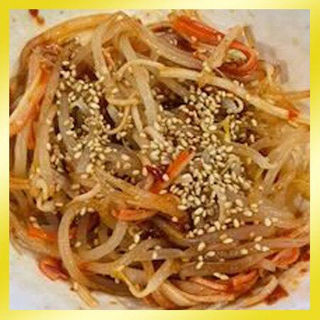 お客様のコメント:ピリ辛ナムル(と言いながらプチ和風)です。2分半茹でたもやしのお湯を切って、まず「ほんだし」少々(←これがミソです)、そしてごま油、醤油、若干の豆板醤を投入してかき混ぜ、カニカマも追加。最後に白ごまをふりかけて出来上がりです。味噌ラーメン用のもやしの余った分を別テイストでまとめてみました。